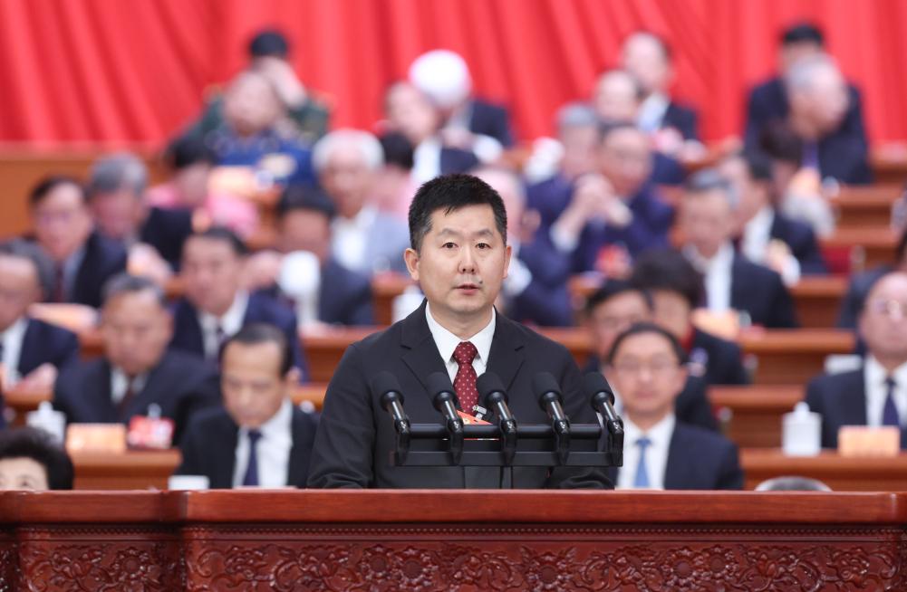 Zhang Kun, a member of the 14th National Committee of the Chinese People's Political Consultative Conference (CPPCC), speaks on behalf of the Communist Youth League of China and the All-China Youth Federation at the third plenary meeting of the third session of the 14th CPPCC National Committee at the Great Hall of the People in Beijing, capital of China, March 9, 2025. (Xinhua/Liu Weibing)