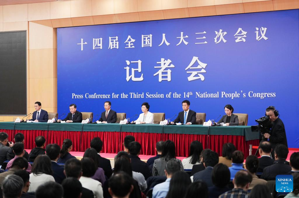 Lei Haichao, head of China's National Health Commission, attends a press conference on people's livelihood for the third session of the 14th National People's Congress (NPC) in Beijing, capital of China, March 9, 2025. Minister of Civil Affairs Lu Zhiyuan, Minister of Human Resources and Social Security Wang Xiaoping, and Minister of Housing and Urban-Rural Development Ni Hong also attended the press conference on Sunday. (Xinhua/Lyu Shuai)