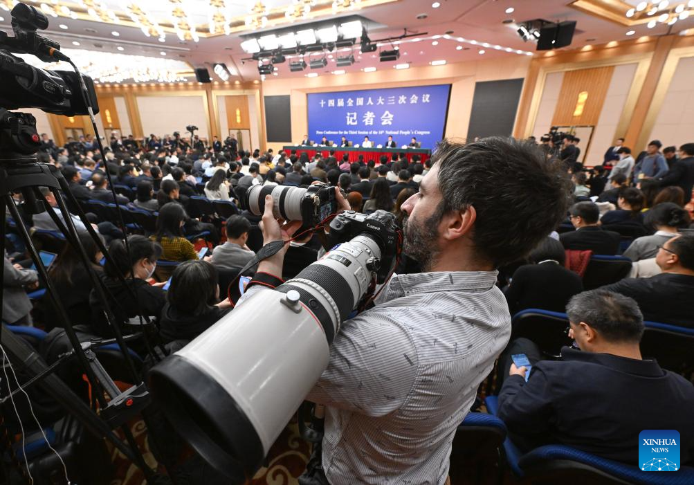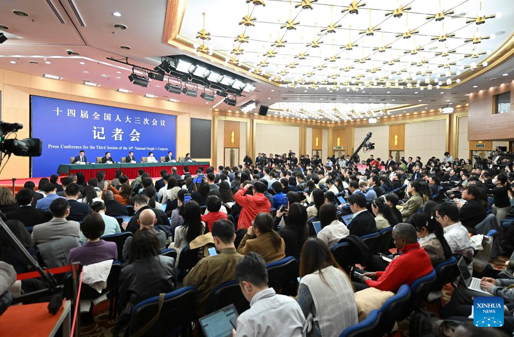 Journalists work at a press conference on people's livelihood for the third session of the 14th National People's Congress (NPC) in Beijing, capital of China, March 9, 2025. China's Minister of Civil Affairs Lu Zhiyuan, Minister of Human Resources and Social Security Wang Xiaoping, Minister of Housing and Urban-Rural Development Ni Hong, and head of the National Health Commission Lei Haichao attended the press conference on Sunday. (Xinhua/Chen Yehua)