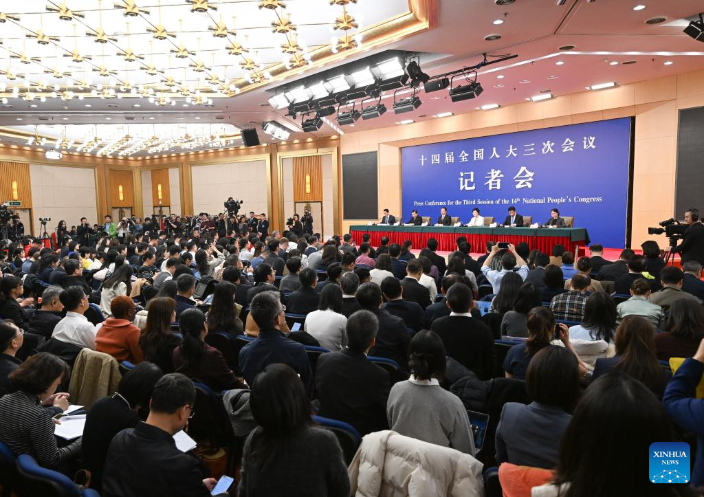 Journalists work at a press conference on people's livelihood for the third session of the 14th National People's Congress (NPC) in Beijing, capital of China, March 9, 2025. China's Minister of Civil Affairs Lu Zhiyuan, Minister of Human Resources and Social Security Wang Xiaoping, Minister of Housing and Urban-Rural Development Ni Hong, and head of the National Health Commission Lei Haichao attended the press conference on Sunday. (Xinhua/Xu Bingjie)