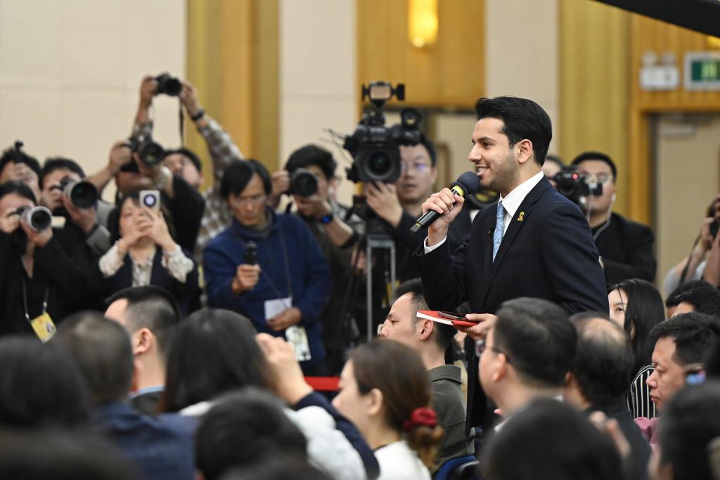 A journalist asks a question at a press conference on people's livelihood for the third session of the 14th National People's Congress (NPC) in Beijing, capital of China, March 9, 2025. China's Minister of Civil Affairs Lu Zhiyuan, Minister of Human Resources and Social Security Wang Xiaoping, Minister of Housing and Urban-Rural Development Ni Hong, and head of the National Health Commission Lei Haichao attended the press conference on Sunday. (Xinhua/Xu Bingjie)