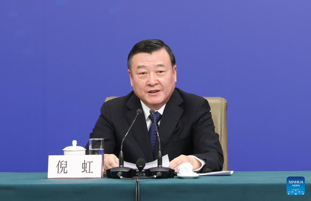China's Minister of Housing and Urban-Rural Development Ni Hong attends a press conference on people's livelihood for the third session of the 14th National People's Congress (NPC) in Beijing, capital of China, March 9, 2025. Minister of Civil Affairs Lu Zhiyuan, Minister of Human Resources and Social Security Wang Xiaoping, and head of the National Health Commission Lei Haichao also attended the press conference on Sunday. (Xinhua/Lyu Shuai)
