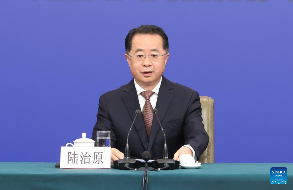 China's Minister of Civil Affairs Lu Zhiyuan attends a press conference on people's livelihood for the third session of the 14th National People's Congress (NPC) in Beijing, capital of China, March 9, 2025. Minister of Human Resources and Social Security Wang Xiaoping, Minister of Housing and Urban-Rural Development Ni Hong, and head of the National Health Commission Lei Haichao also attended the press conference on Sunday. (Xinhua/Lyu Shuai)