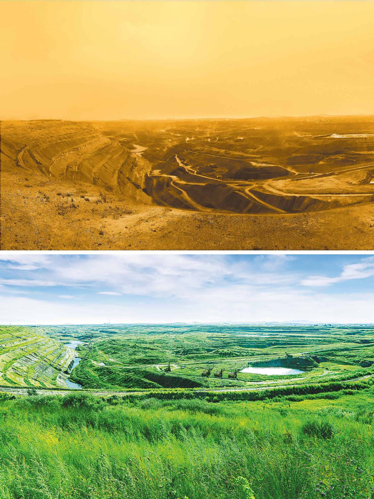 Comparison of an open-pit mine in Hulunbuir, Inner Mongolia autonomous region, before (top) and after (above) a five-year ecological restoration project. (Photo/Xinhua)