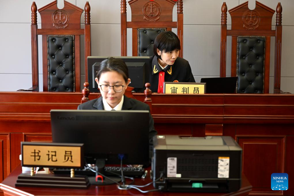 Kong Dehan (L), a judge with the People's Court of Haidian District of Beijing, processes a case at the People's Court of Haidian District in Beijing, capital of China, March 6, 2025.(Xinhua/Huang Bohan)