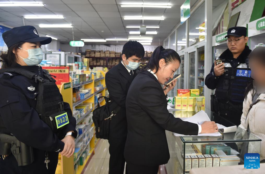 Liu Ying (3rd L), a judge with the People's Court of Haidian District of Beijing, talks with a litigant via a phone at a pharmacy in Beijing, capital of China, March 4, 2025. A person's face (1st R) is blurred for privacy protection.(Xinhua/Zhao Tingting)