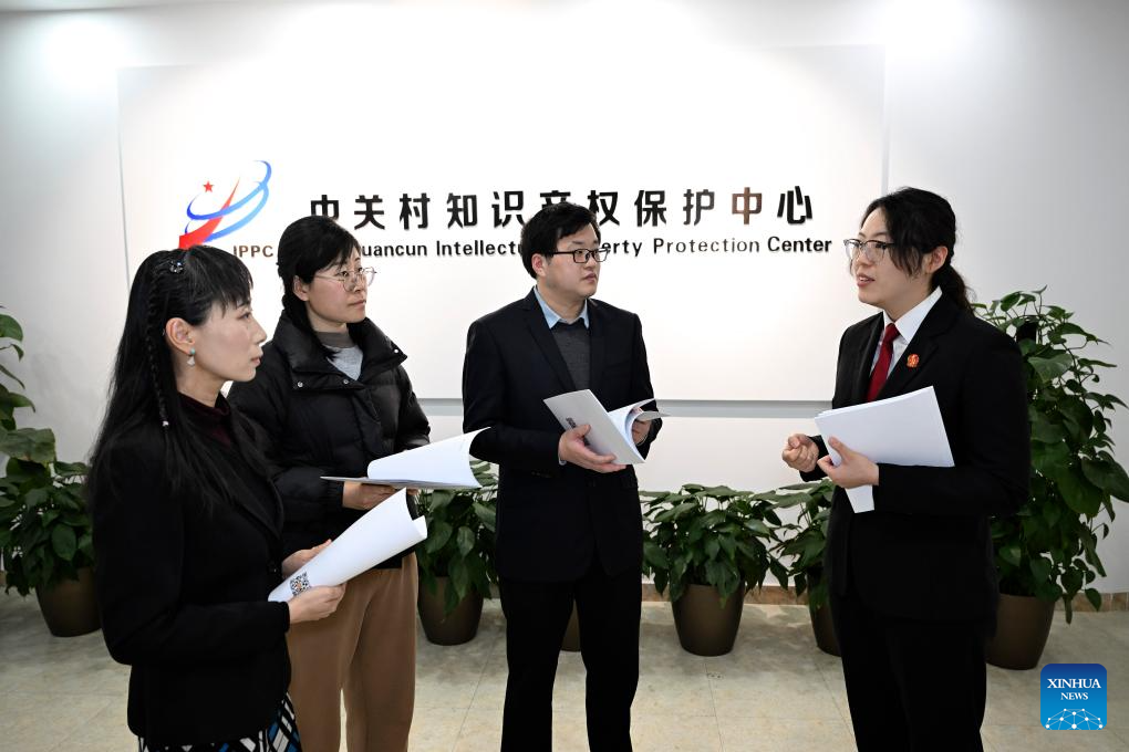 Li Sidi (1st R), a judge with the People's Court of Haidian District of Beijing, talks with staff members of Zhongguancun Intellectual Property Protection Center in Beijing, capital of China, March 7, 2025.(Xinhua/Huang Bohan)