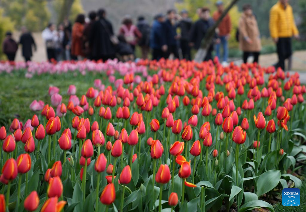 Tourists enjoy tulip flowers at a park in the West Lake scenic area in Hangzhou, east China's Zhejiang Province, March 10, 2025. (Xinhua/Han Chuanhao)