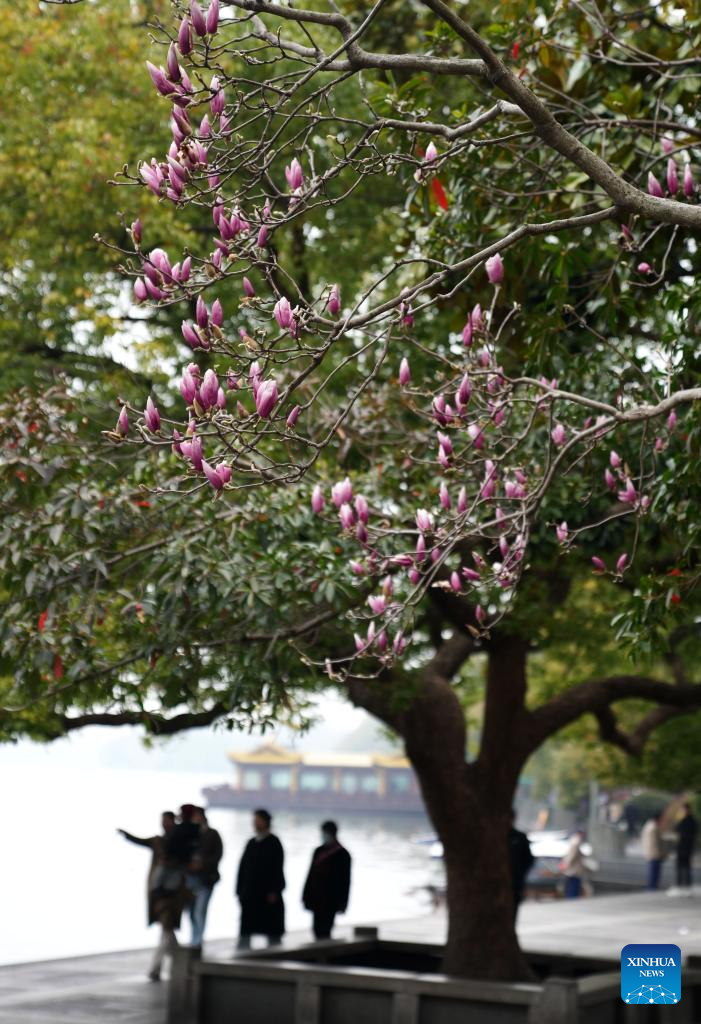 Tourists walk past purple flowering magnolia trees around the West Lake in Hangzhou, east China's Zhejiang Province, March 10, 2025. (Xinhua/Han Chuanhao)