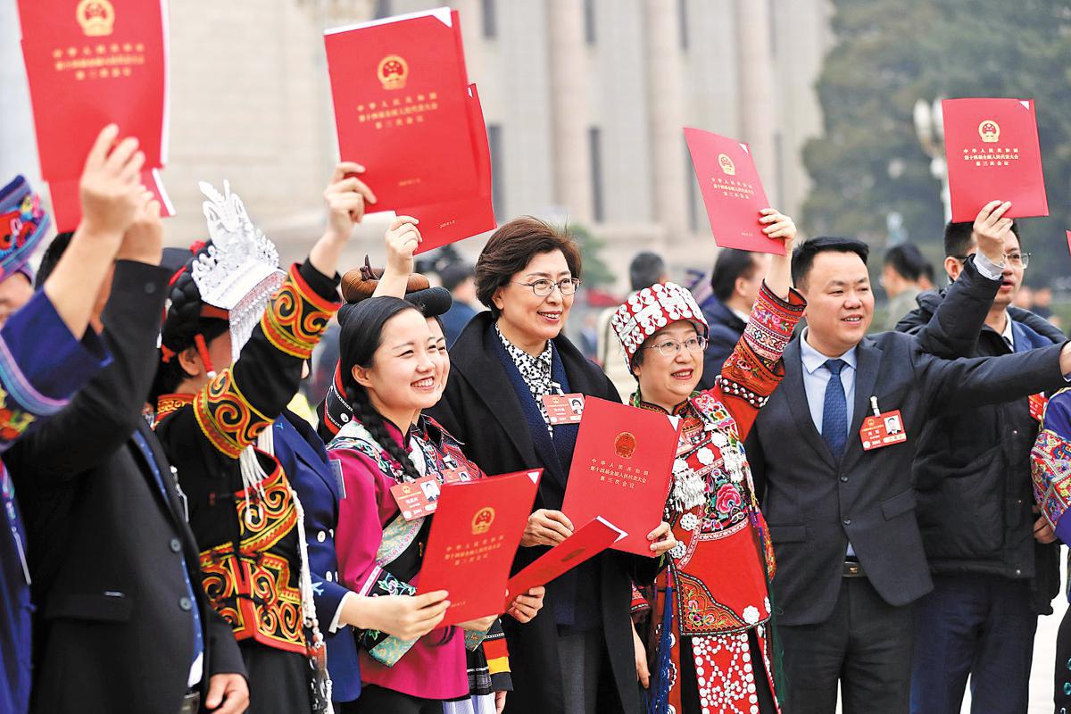 National lawmakers pose in front of the Great Hall of the People in Beijing on Tuesday after the closing meeting of the third session of the 14th National People's Congress. (Zhang Wei/China Daily)