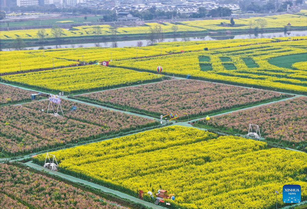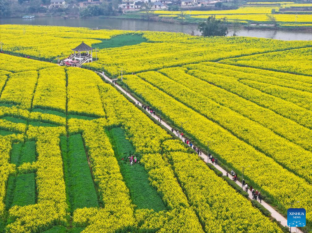 Tourists enjoy the scenery of rapeseed flowers at Chongkan scenic spot in Tongnan District, southwest China's Chongqing Municipality, March 12, 2025. As spring unfolds, rapeseed flowers here have entered the blooming season, attracting tourists to visit. (Xinhua/Wang Quanchao)