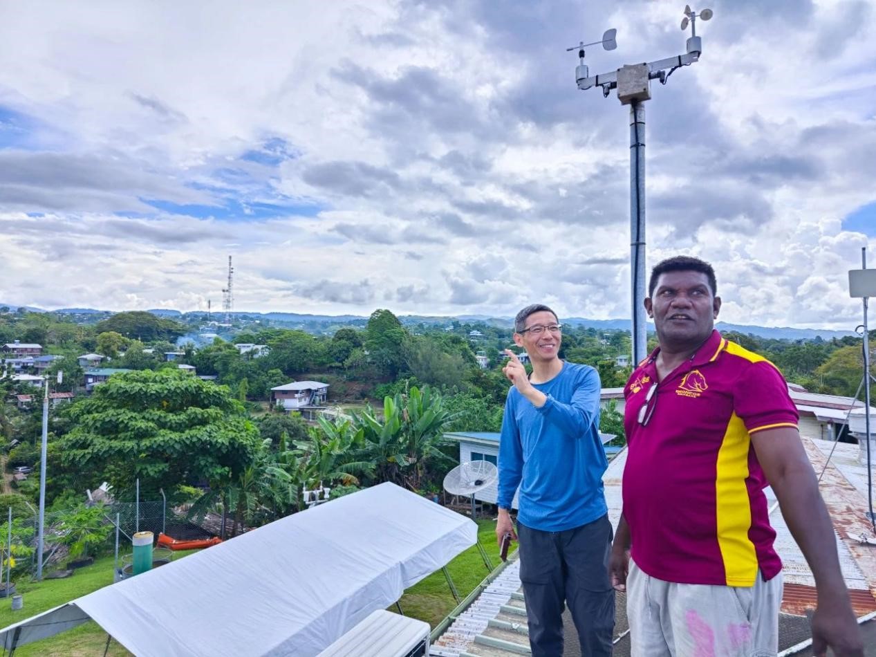 A Chinese expert and a local meteorologist jointly analyze the development trends of weather systems at an observation site of the Solomon Islands Meteorological Services. (Photo/Yang Guojie)