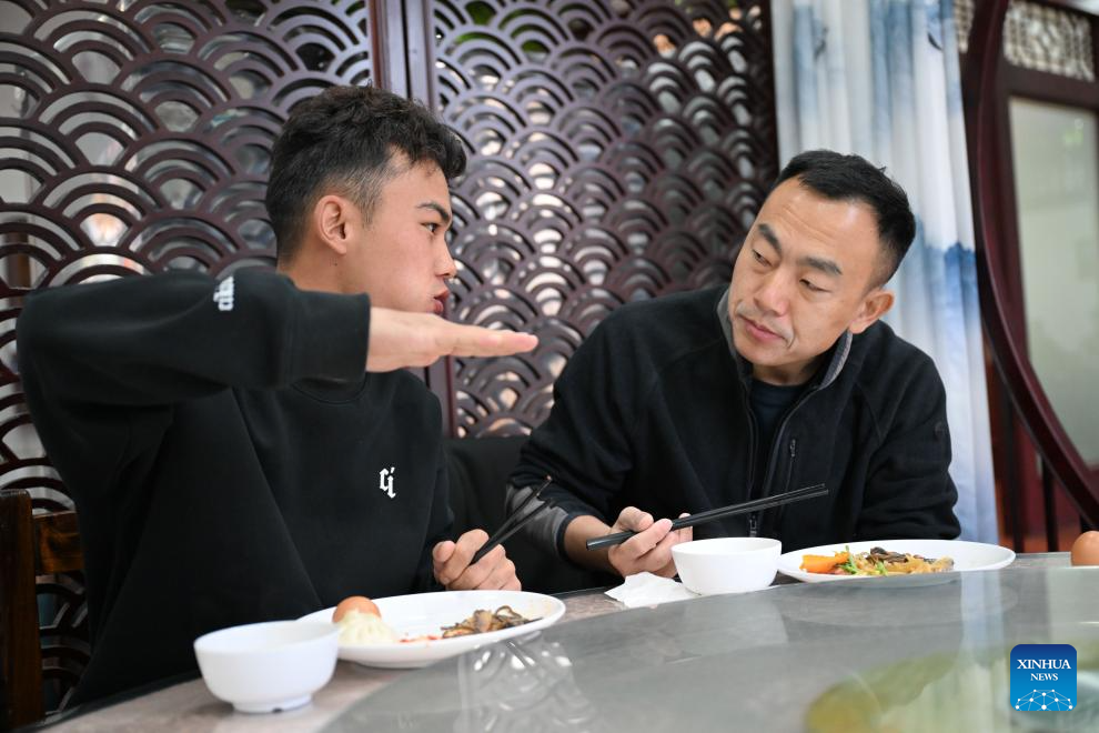 Mirbek Tlobek (L) and his instructor Qu Jingwei discuss during breakfast in Xinyuan County, Ili Kazak Autonomous Prefecture, northwest China's Xinjiang Uygur Autonomous Region, on March 8, 2025. (Xinhua/Ding Lei)