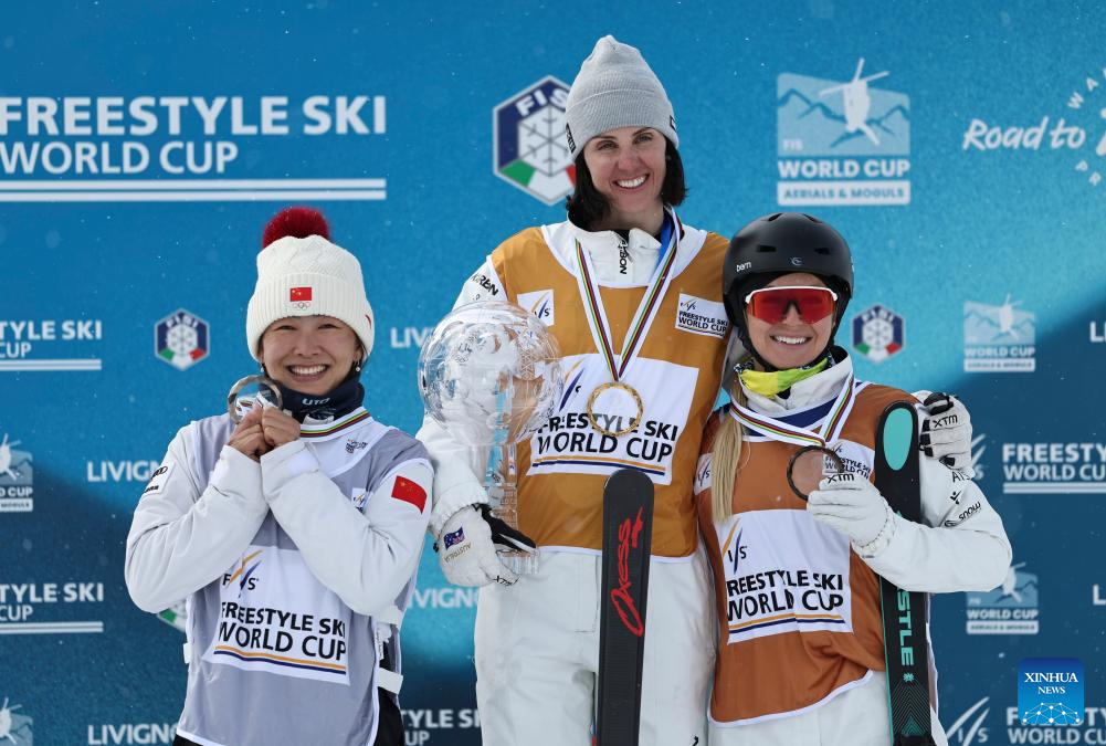 Globe winner Australia's Laura Peel (C) celebrates with the crystal globe along with second placed China's Xu Mengtao (L) and third placed Australia's Danielle Scott during presenting ceremony for the FIS World Cup Globe awards of Women's Aerials at the Livigno Aerials & Moguls Park, in Livigno, Italy, March 13, 2025. (Xinhua/Li Jing)