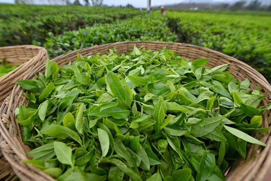 Freshly picked tea leaves are pictured at an organic tea plantation in Baisha Li Autonomous County of south China's Hainan Province, Feb. 21, 2025. (Xinhua/Guo Cheng)