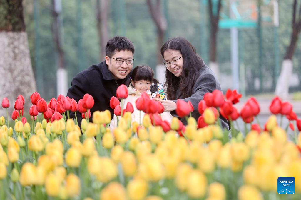 Tourists pose for a selfie near a field of blooming tulips at a park in Huzhou City, east China's Zhejiang Province, March 15, 2025. As the spring season is coming, flowers are in full bloom across the country. (Photo by Xie Shangguo/Xinhua)