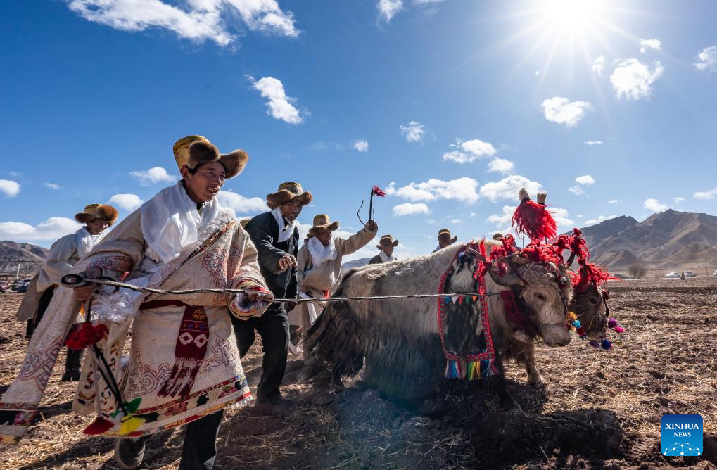Farmers participate in a ceremony marking the start of spring farming in Codoi Township, Lhunzhub County of Lhasa, southwest China's Xizang Autonomous Region, March 16, 2025. Ceremonies marking the start of spring farming were held across Xizang on Sunday. The ceremony holds great significance as it marks the beginning of a new year's farming season and serves as a prayer for favorable weather and bountiful harvests. It is considered an important ritual in the farming regions of Xizang. (Xinhua/Jigme Dorje)