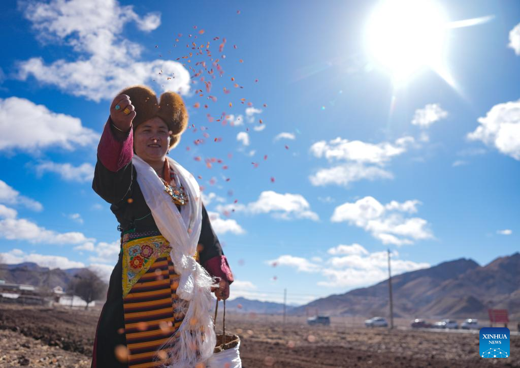 A farmer participates in a ceremony marking the start of spring farming in Codoi Township, Lhunzhub County of Lhasa, southwest China's Xizang Autonomous Region, March 16, 2025. Ceremonies marking the start of spring farming were held across Xizang on Sunday. The ceremony holds great significance as it marks the beginning of a new year's farming season and serves as a prayer for favorable weather and bountiful harvests. It is considered an important ritual in the farming regions of Xizang. (Xinhua/Jigme Dorje)