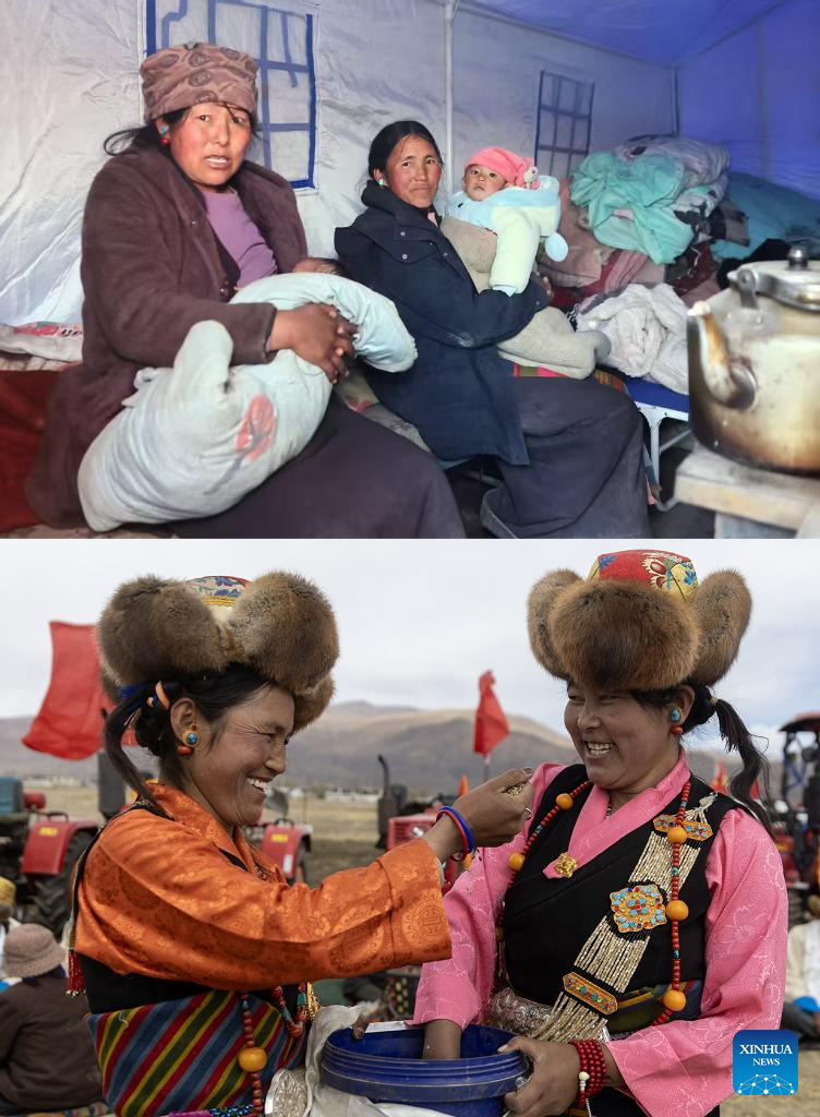 This combo photo shows Tenzin Droma (R) and her fellow villager staying at a temporary shelter after a 6.8-magnitude earthquake struck southwest China's Xizang on January, taken on Jan. 7, 2025 (above); and they participate in a ceremony marking the start of spring farming in Quxar Town of Lnaze County, southwest China's Xizang Autonomous Region on March 16, 2025 (below). Ceremonies marking the start of spring farming were held across Xizang on Sunday. The ceremony holds great significance as it marks the beginning of a new year's farming season and serves as a prayer for favorable weather and bountiful harvests. It is considered an important ritual in the farming regions of Xizang. (Xinhua/Jiang Fan)