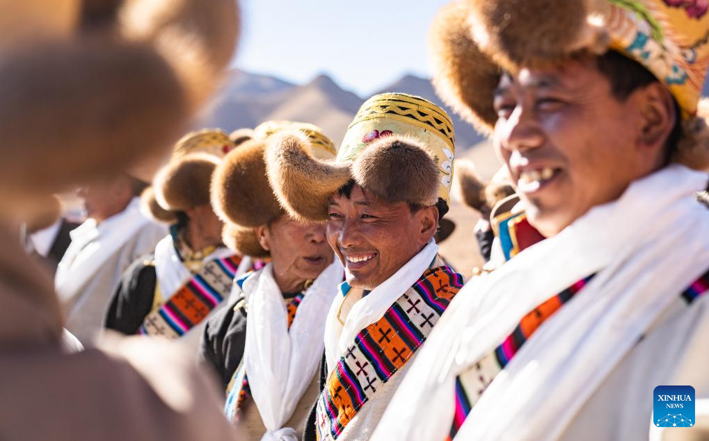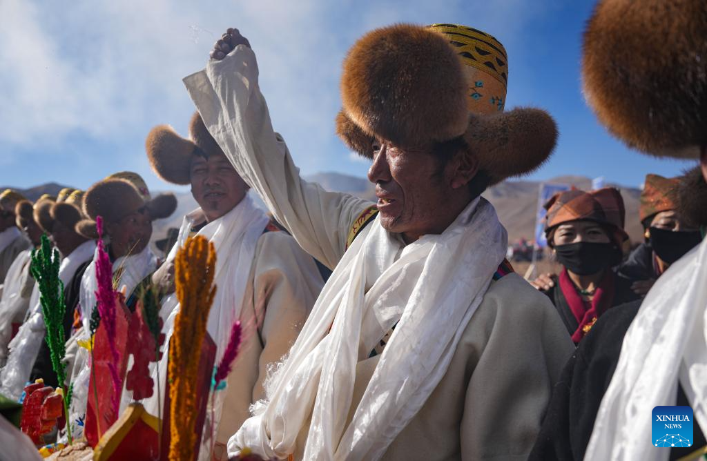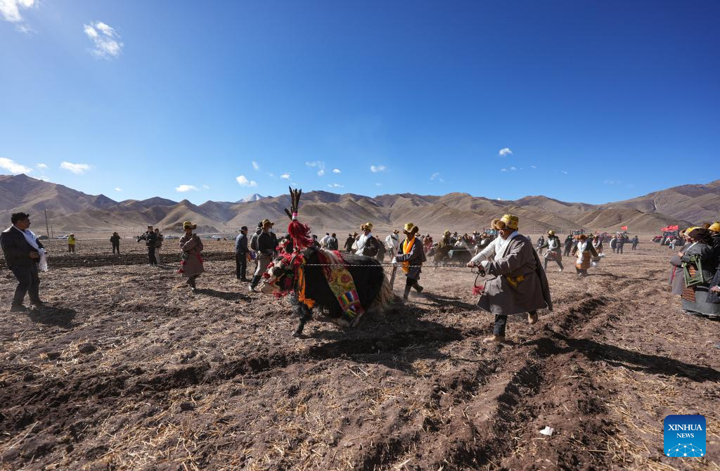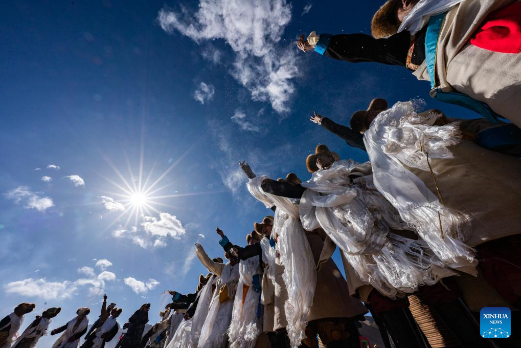 Farmers participate in a ceremony marking the start of spring farming in Quxar Town of Lnaze County, southwest China's Xizang Autonomous Region, March 16, 2025. Ceremonies marking the start of spring farming were held across Xizang on Sunday. The ceremony holds great significance as it marks the beginning of a new year's farming season and serves as a prayer for favorable weather and bountiful harvests. It is considered an important ritual in the farming regions of Xizang. (Xinhua/Jiang Fan)