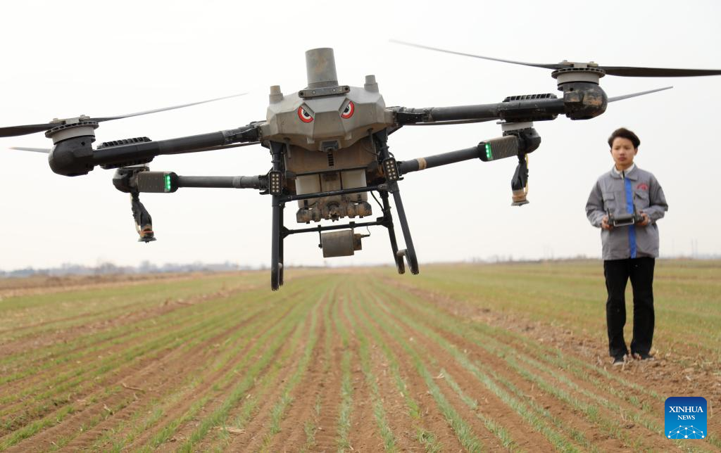 Drones work over a wheat field of an agricultural cooperative in Xiayi County, central China's Henan Province, March 13, 2025. Various modern technologies are being used during the spring ploughing farm work across the country. (Photo by Miao Yucai/Xinhua)
