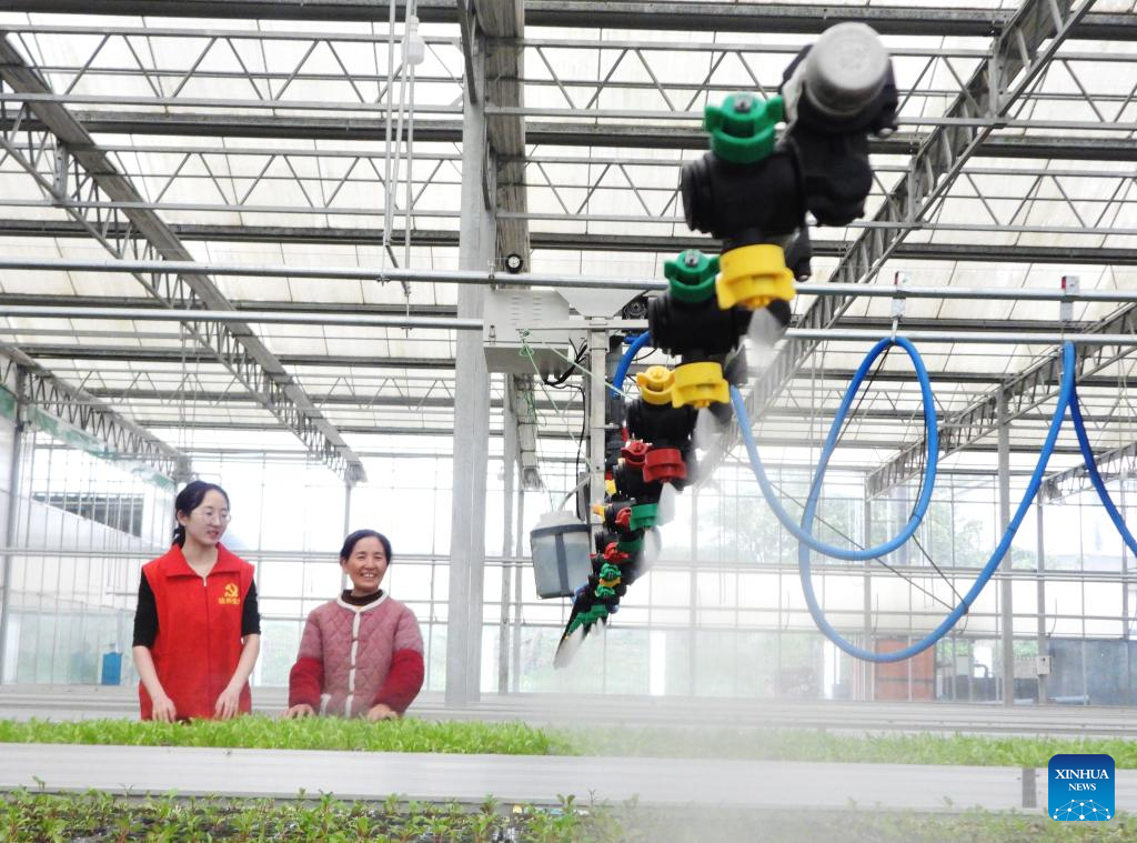A worker arranges seedlings at a cultivation center of an agricultural research institute in Wenxian County, Jiaozuo City of central China's Henan Province, March 14, 2025. Various modern technologies are being used during the spring ploughing farm work across the country. (Photo by Xu Hongxing/Xinhua)