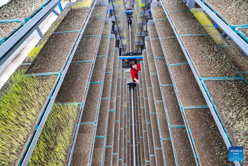A worker checks the growth of paddy rice seedlings at a smart seedling cultivation factory in Dongheng Village, Huzhou City of east China's Zhejiang Province, March 14, 2025. Various modern technologies are being used during the spring ploughing farm work across the country. (Photo by Xie Shangguo/Xinhua)
