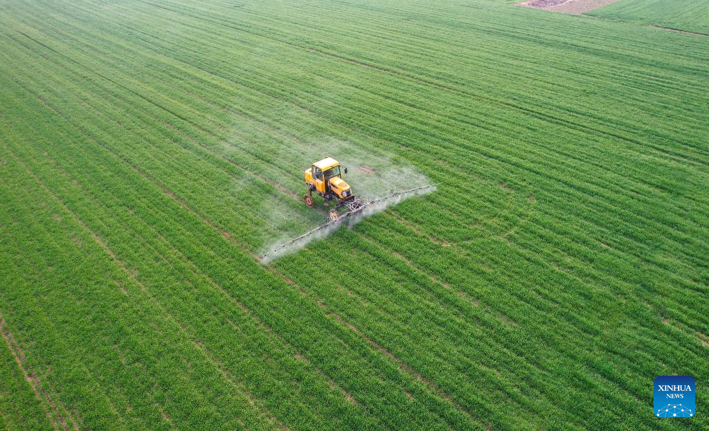 A farmer operates a drone to spray pesticide in a field in Zhaozhuangzi Village, Cangzhou City of north China's Hebei Province, March 14, 2025. Various modern technologies are being used during the spring ploughing farm work across the country. (Photo by Zhou Yang/Xinhua)