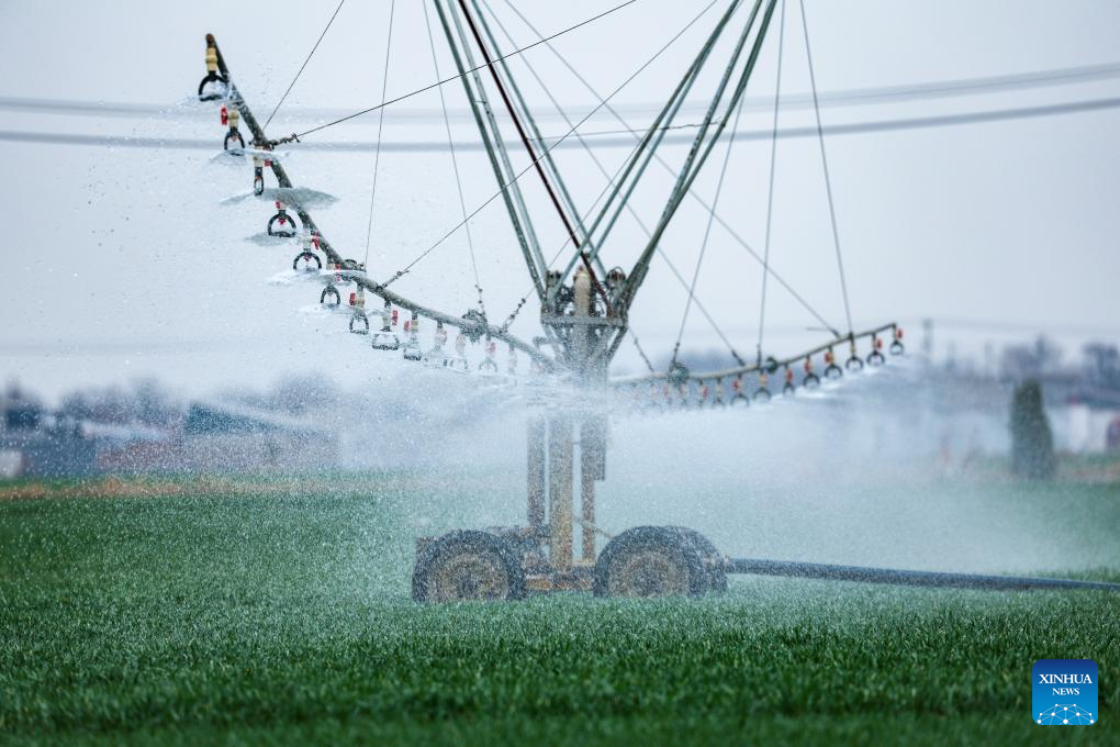 An irrigation machine conducts water-saving irrigation at a cooperative in Shijiazhuang City, north China's Hebei Province, March 14, 2025. Various modern technologies are being used during the spring ploughing farm work across the country. (Photo by Zhang Xiaofeng/Xinhua)