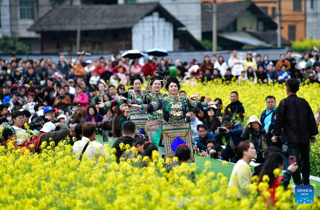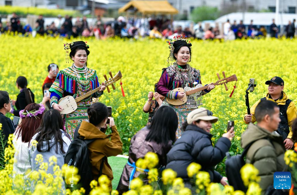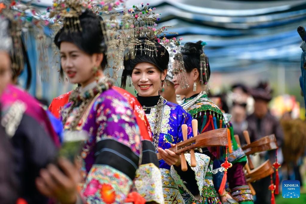 Villagers in ethnic costumes take part in a rural fashion show in Rongjiang County, southwest China's Guizhou Province, March 16, 2025.