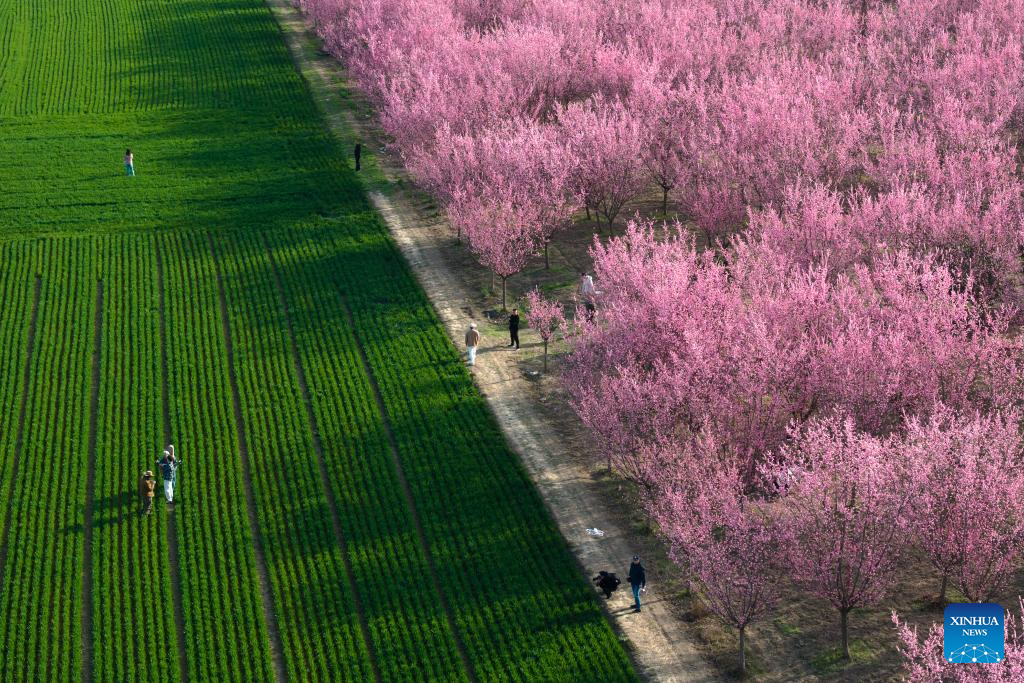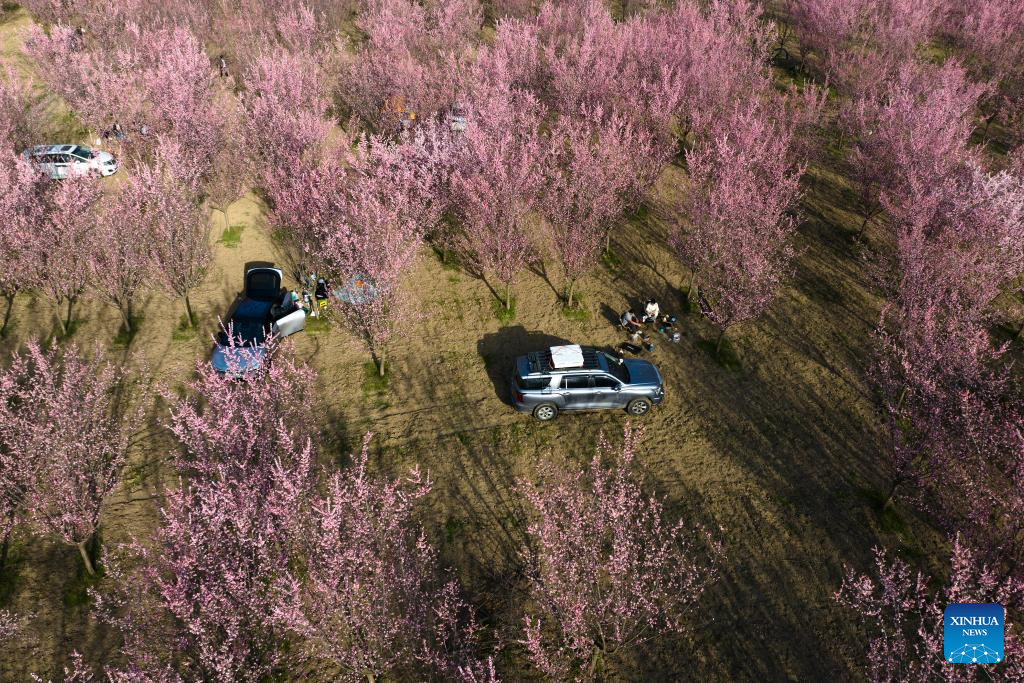 An aerial drone photo taken on March 18, 2025 shows tourists enjoying leisure time amid blooming plum flowers at a plantation in Huyi District of Xi'an, northwest China's Shaanxi Province. (Xinhua/Shao Rui)