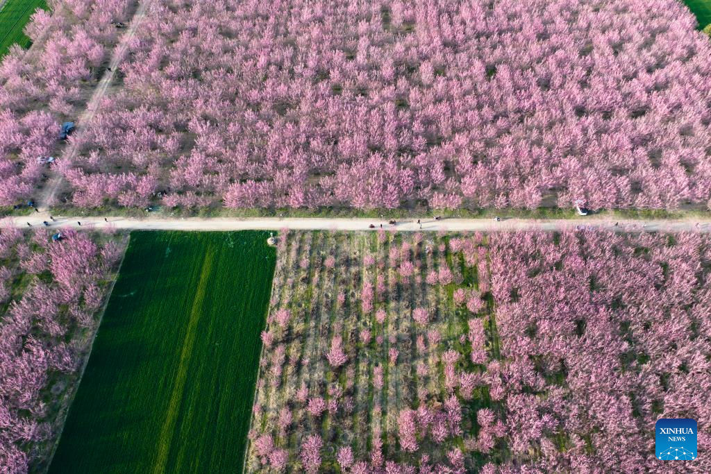 An aerial drone photo taken on March 18, 2025 shows blooming plum flowers at a plantation in Huyi District of Xi'an, northwest China's Shaanxi Province. (Xinhua/Shao Rui)