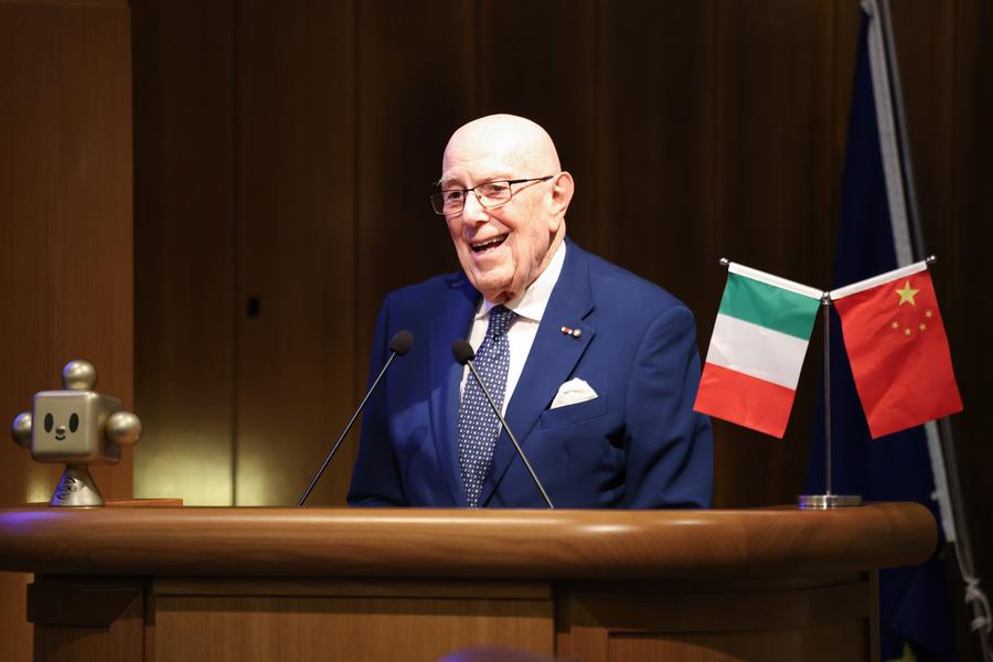 Mario Boselli, chairman of the Italy China Council Foundation, speaks during a roadshow of the third China International Supply Chain Expo (CISCE) in Milan, Italy, on March 18, 2025. A roadshow of the CISCE was held Tuesday in Milan, Italy, with bilateral cooperation highlighted and cooperation agreements signed. (Xinhua/Li Jing)