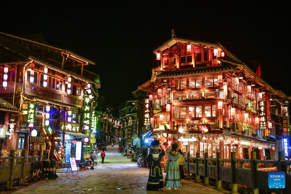 This photo taken on March 17, 2025 shows a night view of the Zhaoxing Dong Village in Liping County of Qiandongnan Miao and Dong Autonomous Prefecture, southwest China's Guizhou Province. Located in Liping County of Qiandongnan Miao and Dong Autonomous Prefecture, Zhaoxing Dong Village is home to over a thousand households of the Dong ethnic group. The traditional architectural style and rich cultural heritage of the Dong ethnic group are well-preserved.