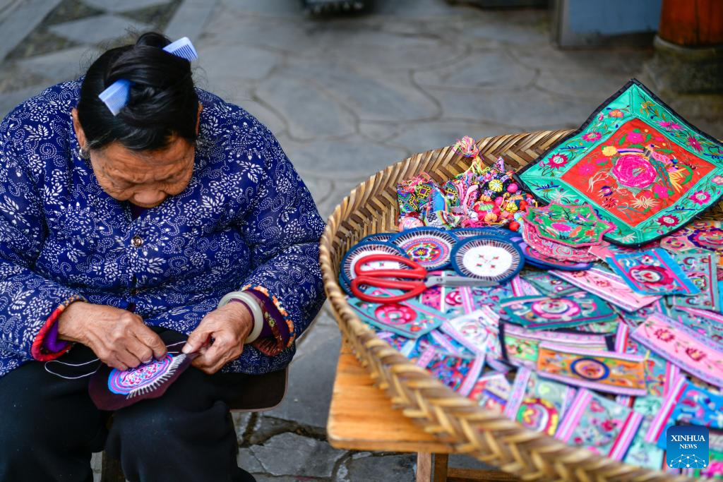 A villager makes embroideries at the Zhaoxing Dong Village in Liping County of Qiandongnan Miao and Dong Autonomous Prefecture, southwest China's Guizhou Province, March 18, 2025. Located in Liping County of Qiandongnan Miao and Dong Autonomous Prefecture, Zhaoxing Dong Village is home to over a thousand households of the Dong ethnic group. The traditional architectural style and rich cultural heritage of the Dong ethnic group are well-preserved.