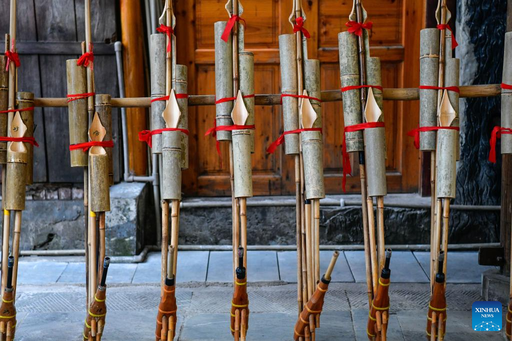 This photo taken on March 17, 2025 shows Lusheng, a traditional musical instrument, at the Zhaoxing Dong Village in Liping County of Qiandongnan Miao and Dong Autonomous Prefecture, southwest China's Guizhou Province. Located in Liping County of Qiandongnan Miao and Dong Autonomous Prefecture, Zhaoxing Dong Village is home to over a thousand households of the Dong ethnic group. The traditional architectural style and rich cultural heritage of the Dong ethnic group are well-preserved.