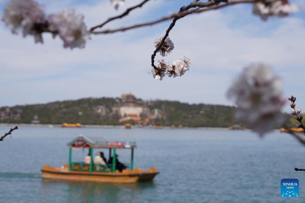 Tourists go boating and enjoy the blossoms at the Summer Palace in Beijing, capital of China, March 19, 2025. (Xinhua/Yin Dongxun)