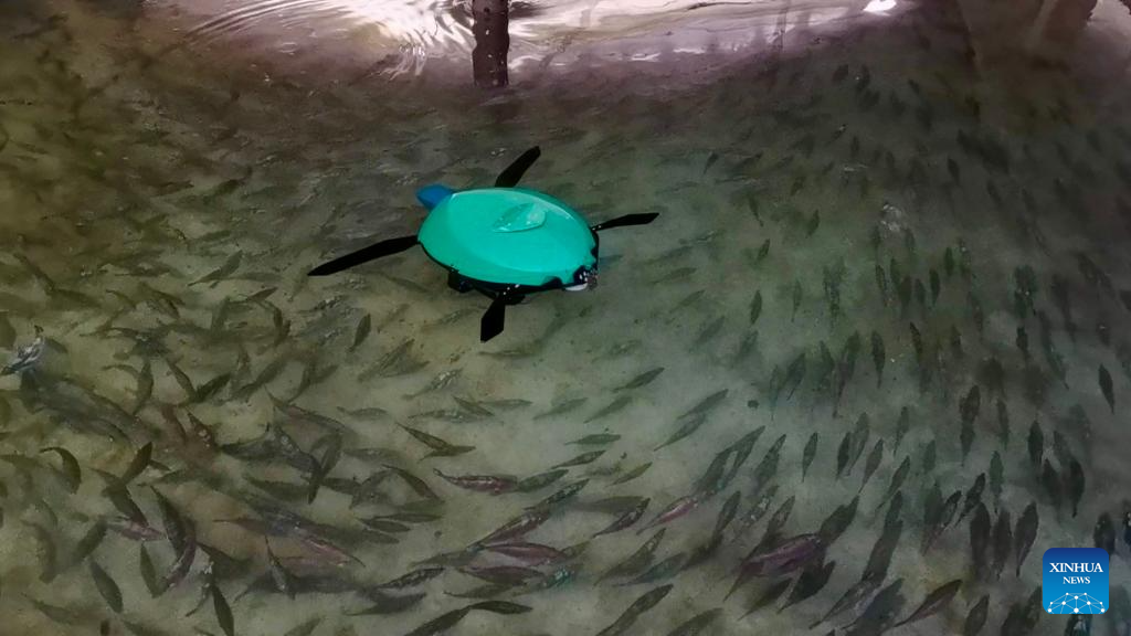 This photo taken on May 3, 2024 shows an amphibious bionic turtle robot at a fish farm in Dalian, northeast China's Liaoning Province. (Xinhua)