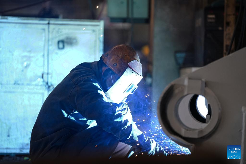 A staff member works at a workshop of Linzhou Heavy Machinery Group Co., Ltd. in the Hongqi Canal Economic and Technological Development Zone of Linzhou City, central China's Henan Province, March 19, 2025. (Xinhua/Li Jianan)