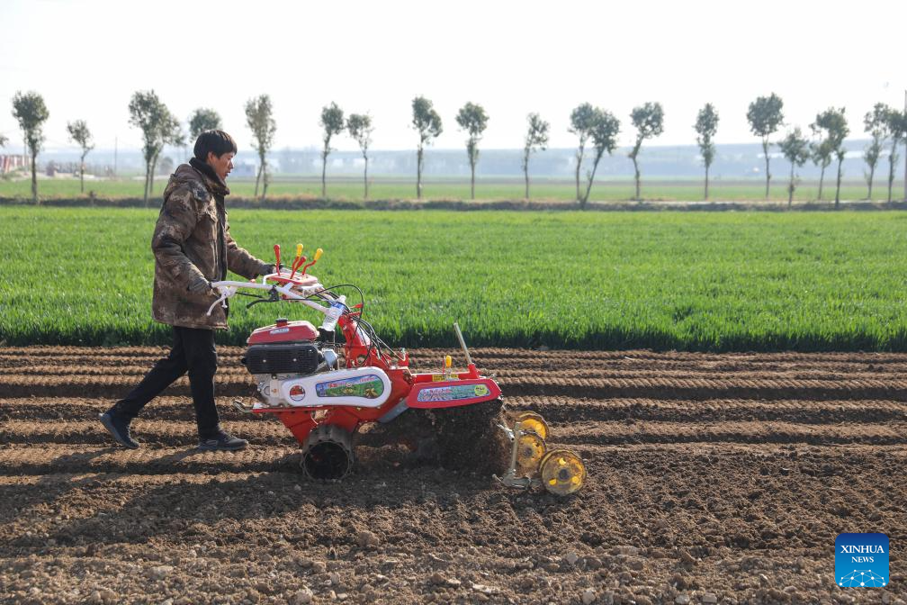 A farmer plows a field with a machine for planting ginger in Xuetan Village of Pingdingshan City, central China's Henan Province, March 19, 2025. With the approaching of spring equinox, or Chunfen in Chinese, the fourth solar term in the Chinese lunar calendar which will fall on March 20 this year, farmers across the country are busy working at fields. (Photo by He Wuchang/Xinhua)