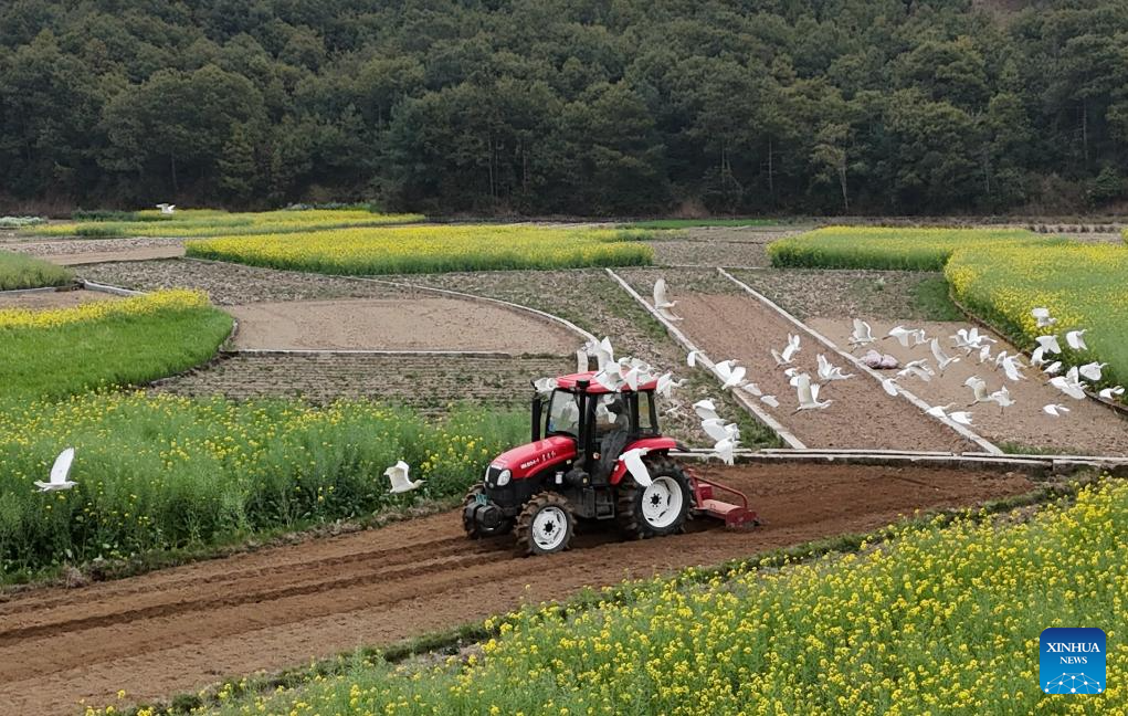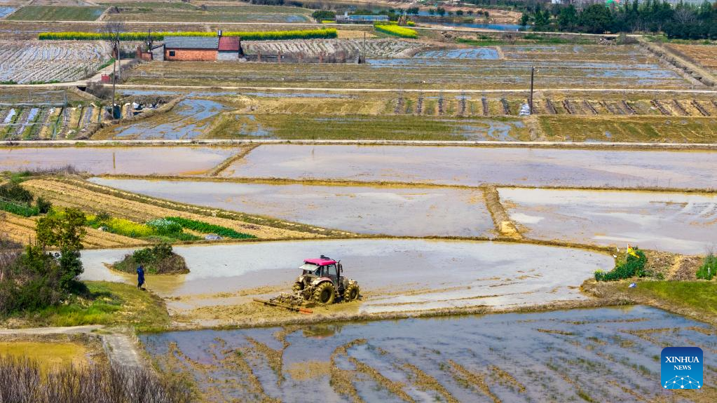 A farmer driving a farm machine plows a field in Shijia Village, Yongzhou City of central China's Hunan Province, March 18, 2025. With the approaching of spring equinox, or Chunfen in Chinese, the fourth solar term in the Chinese lunar calendar which will fall on March 20 this year, farmers across the country are busy working at fields. (Photo by Jiang Keqing/Xinhua)