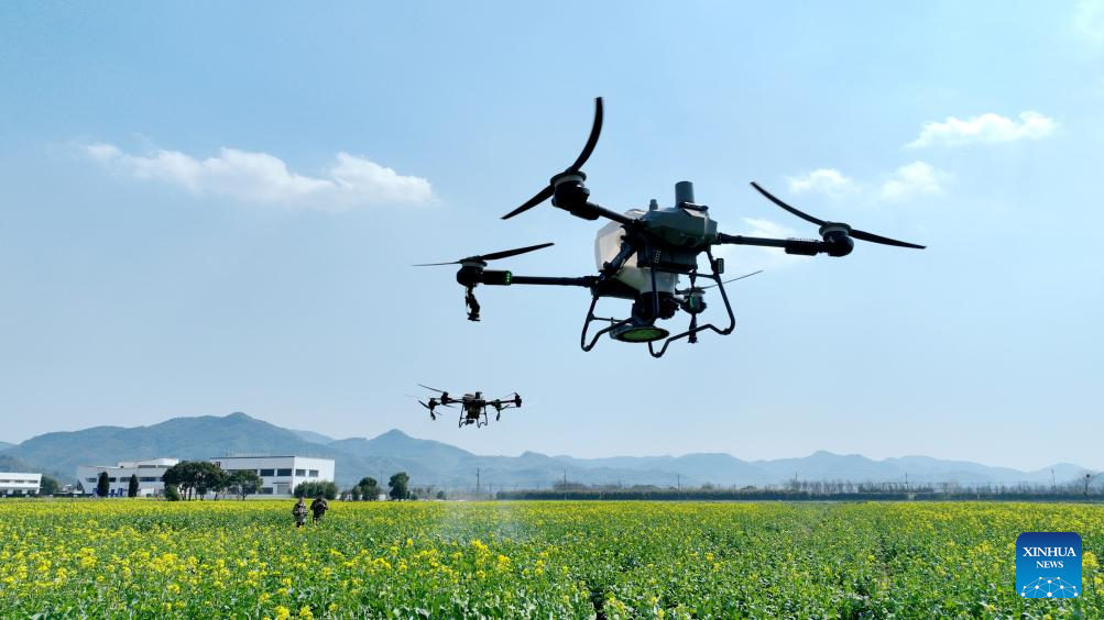 An aerial drone photo taken on March 19, 2025 shows drones working at a canola field in Shangbai Village, Deqing County of east China's Zhejiang Province. With the approaching of spring equinox, or Chunfen in Chinese, the fourth solar term in the Chinese lunar calendar which will fall on March 20 this year, farmers across the country are busy working at fields. (Photo by Xie Shangguo/Xinhua)