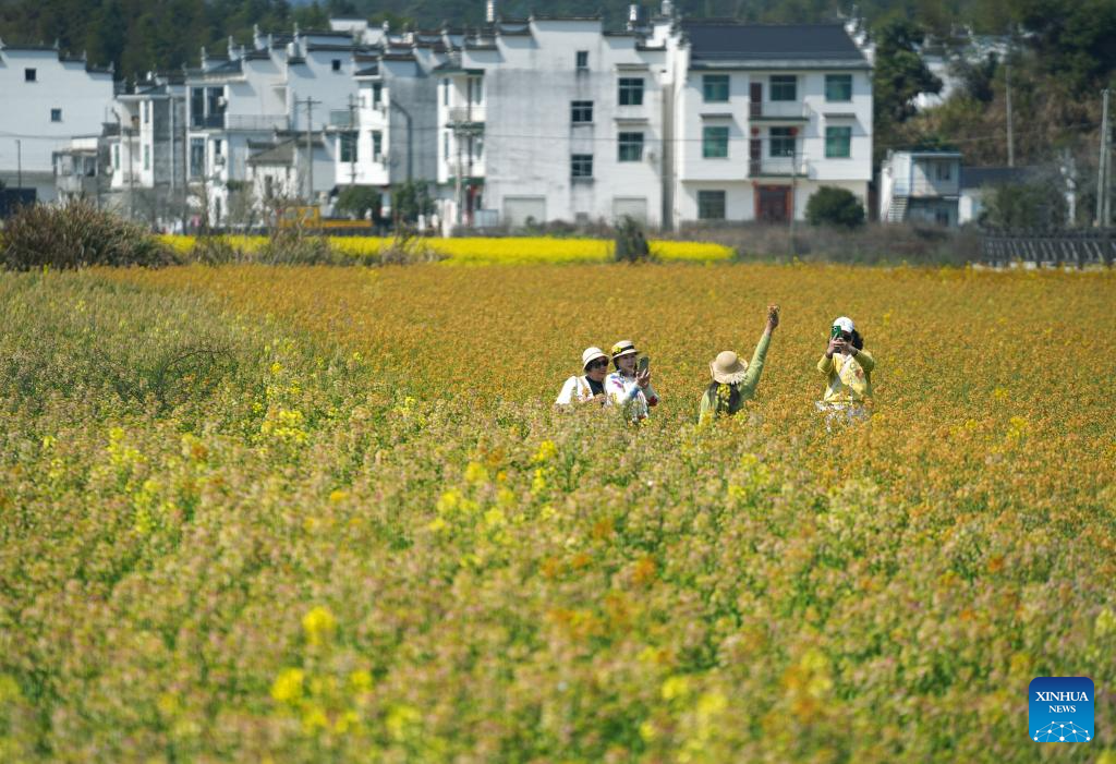 Tourists enjoy blooming cole flowers in Yantian Village of Wuyuan County, east China's Jiangxi Province, March 20, 2025. (Xinhua/Wan Xiang)