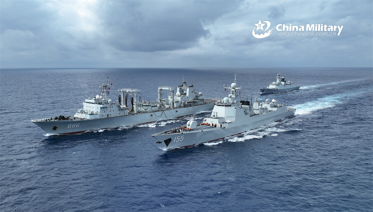 Comprehensive supply ship Qiandaohu (hull 886) and guided-missile destroyer Nanjing (hull 155) attached to a flotilla under the Chinese PLA Navy conduct alongside replenishment at sea during a training exercise on March 4, 2025. (eng.chinamil.com.cn/Photo by Liu Bo)