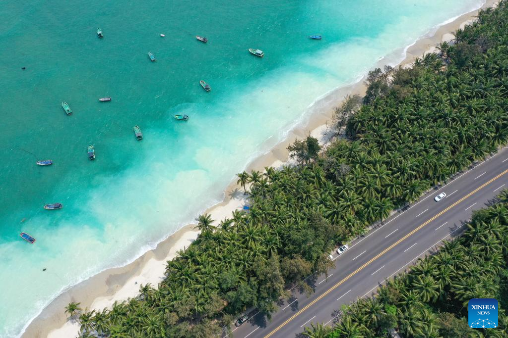 An aerial drone photo taken on March 21, 2025 shows a section of Hainan Coastal Scenic Highway in Qionghai, south China's Hainan Province. Empowered by Boao Forum for Asia, Qionghai has built an exquisite array of rural clusters and embarked on a road to rural revitalization driven by tourism. (Xinhua/Guo Cheng)