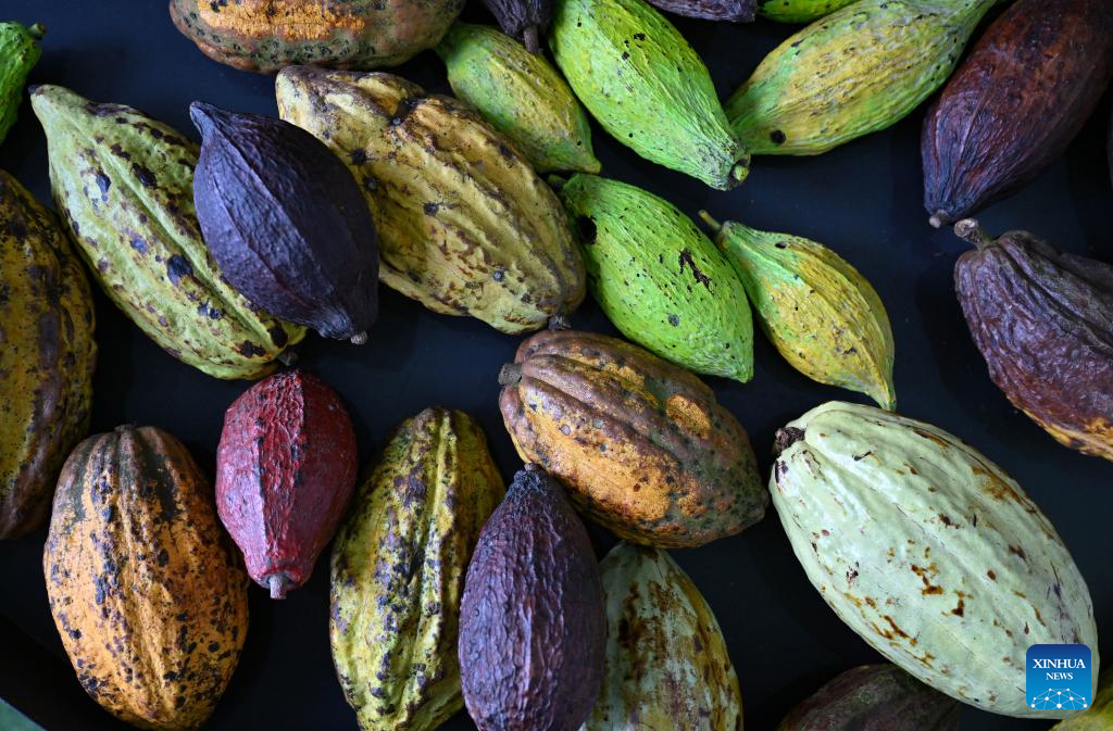 This photo taken on March 19, 2025 shows cocoa fruits at a tropical fruits exhibition area in Qionghai, south China's Hainan Province. Empowered by Boao Forum for Asia, Qionghai has built an exquisite array of rural clusters and embarked on a road to rural revitalization driven by tourism. (Xinhua/Guo Cheng)