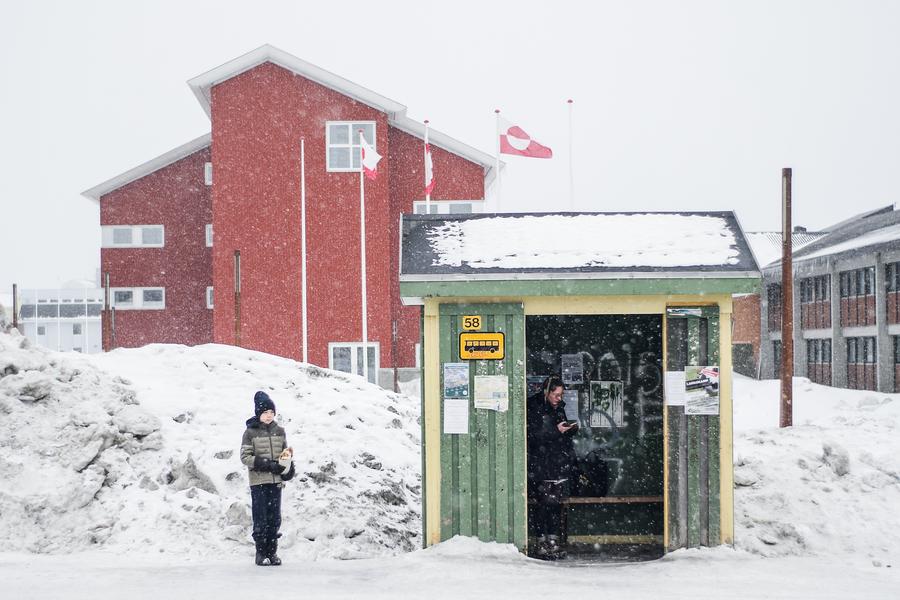 A boy waits for bus in the snow with flowers in hands in Nuuk, Greenland, an autonomous territory of Denmark, March 19, 2025. (Xinhua/Peng Ziyang)