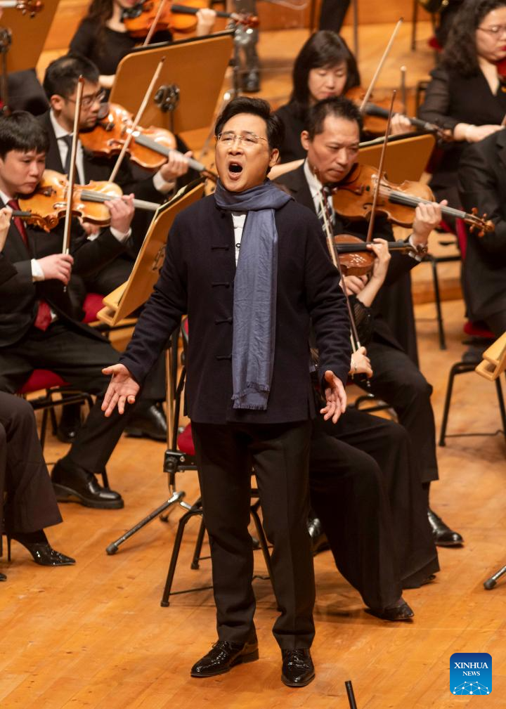 Chinese baritone Liao Changyong sings at the opening performance of the 40th Shanghai Spring International Music Festival in Shanghai, east China, March 23, 2025. The opening performance "Maintaining Peace for the Future", a theme concert commemorating the 80th anniversary of the victory of the Chinese People's War of Resistance Against Japanese Aggression and the World Anti-Fascist War, was held at Shanghai Symphony Hall in Shanghai on Sunday. (Xinhua/Wang Xiang)