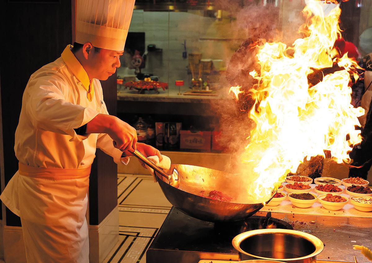 A chef cooks crayfish at a restaurant in Xuyi, Jiangsu province, on March 8. (Wang Jianmin/Xinhua)