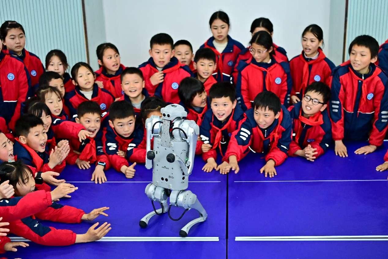 At a primary school in Fuzhou, east China's Jiangxi province, students watch intently as a quadruped robot demonstrates its AI capabilities during class. (People's Daily Online/Zhu Haipeng)